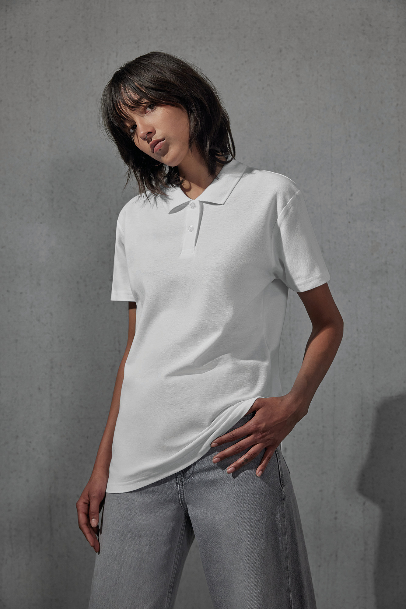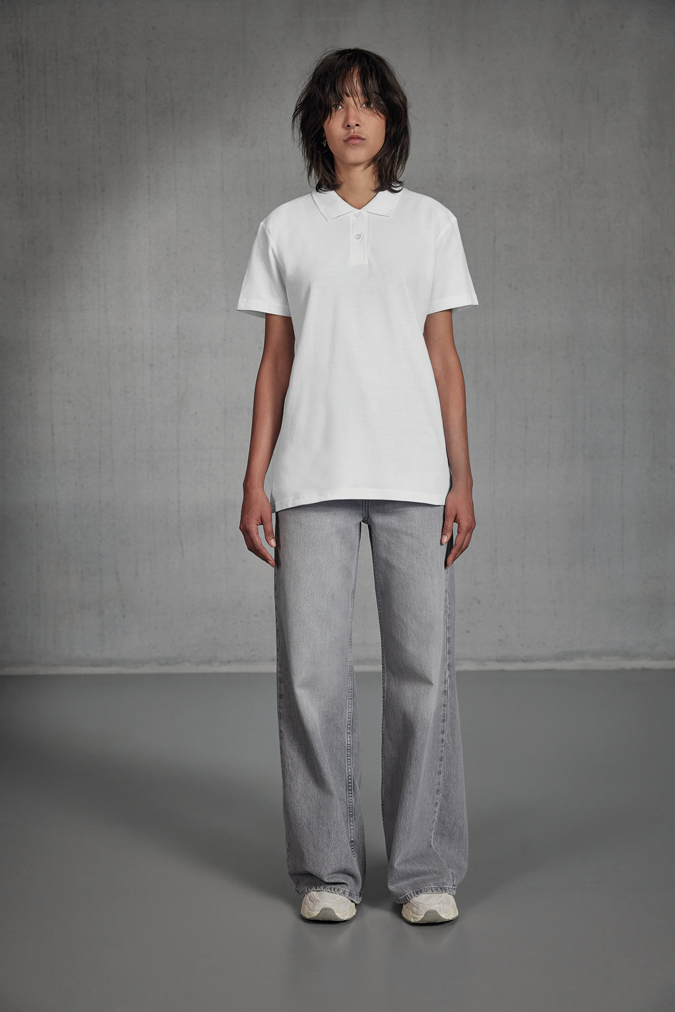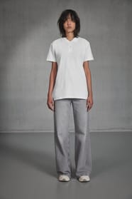 100% algodão ring spun pré-encolhido (excepto H. Grey: 90% algodão ring spun penteado pré-encolhido / 10% viscose). Colarinho em malha 1x1. Tapa costuras no colarinho. Carcela reforçada por banda termo colada com 2 botões. Botões à cor. Corte cintado. Costuras laterais.